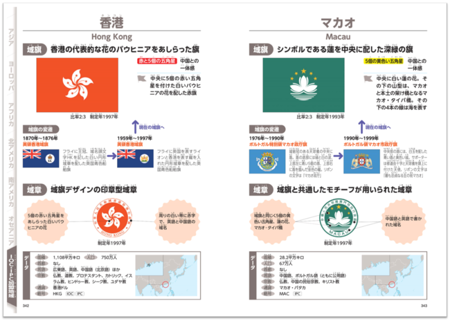 「香港」や「マカオ」など、国以外でオリンピック・パラリンピックに参加できる地域の「域旗・域章」も掲載。2022年2月に開催される冬季オリンピック観戦時にも活躍します。