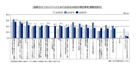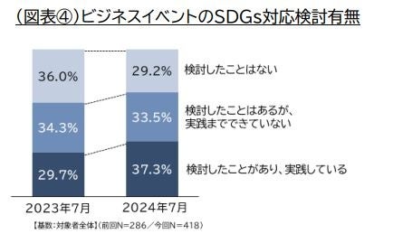イベントを主催するにあたってSDGs対応を検討している割合は7割以上を占めました。特に「実践している」を選択した方が前回調査と比較して5ポイント以上増加、実際の取組みが進んでいるといえます(図表4.)。