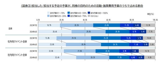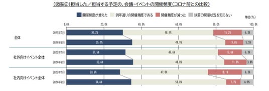 24年度のイベント開催頻度について、増加したとする割合が全体として昨年調査から5%ほど増加し、開催頻度が増えたとする比率は全体平均で35%を超えます(図表2.)。