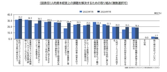 回答者の7割近くが「人的資本経営」に関心を持っており、昨年度調査より増加しています(図表8.)。人的資本経営の課題としては「マネジメント・管理職が育っていない」「組織文化の変革が難しい」と続いており、昨年同様、組織文化の変革は課題として強く認識されているものの、今回は新たに管理者層の育成が強く課題として意識されました(図表9.)。課題解決策としてコミュニケーション活性化が重視されています(図表10.)。