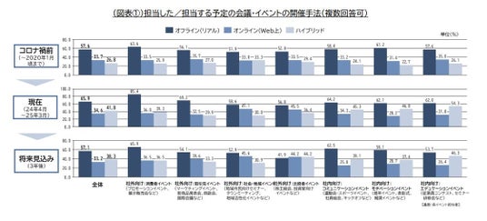 2020年度以前、ビジネスイベント全体ではオフライン開催が57.6%であったのに対して、2024年度は「オフライン」開催が8.3%高くなっており、コロナ禍以前を上回りました。将来については、社外向けイベントのオフライン開催がコロナ以前の水準に戻り、社内向けイベントではコロナ以前に回帰することなく、現状通りハイブリッド開催が多く検討され、オンラインの良さが定着する傾向がみられます(図表1.)。
