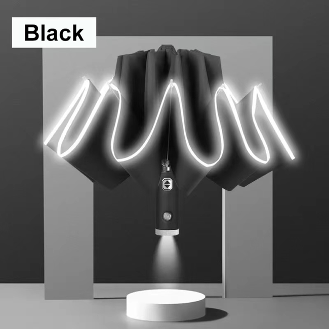 GeeBrella(ジーブレラ)は、LEDライトと反射生地を備えた、雨の夜でも安心の画期的な折りたたみ傘です。