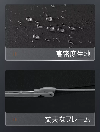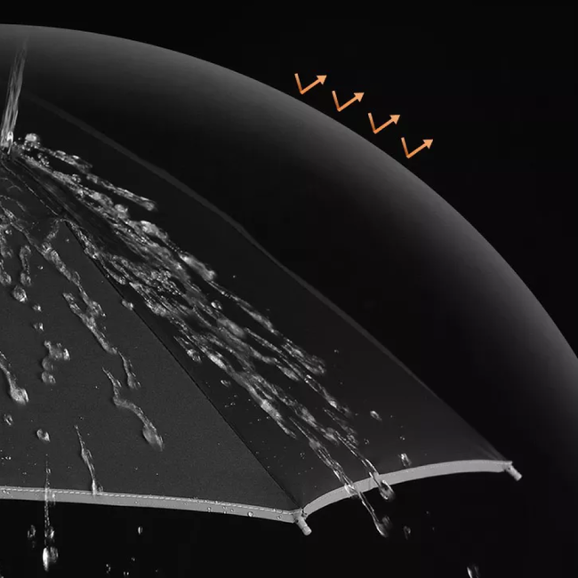 台風やゲリラ豪雨などの強風・豪雨にも耐える丈夫な耐風性仕様となっています。撥水加工が施されているので、軽く傘を振るだけで水が傘の表面を滑り落ちていくので簡単に水をはらえます。