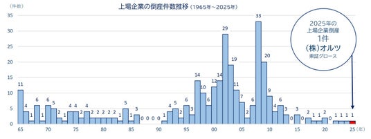 2025年の上場企業倒産(12月29日16時30分現在)は、(株)オルツ(東証グロース)の1社となった。コロナ禍以降(2020年以降)で6社目となる。