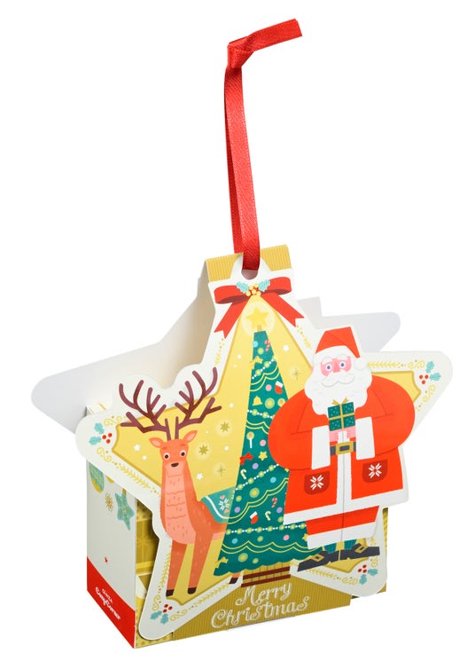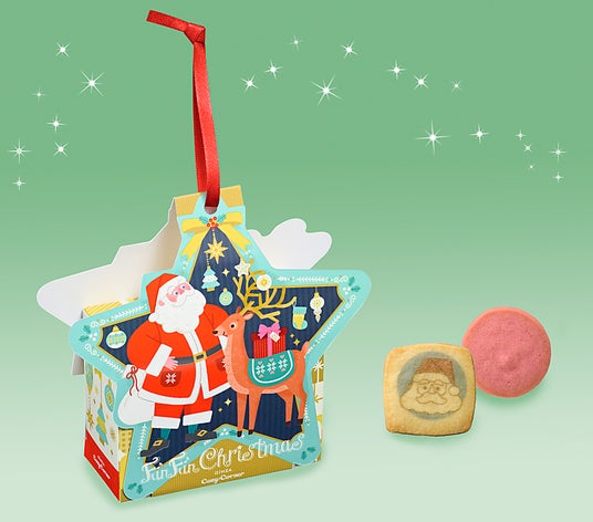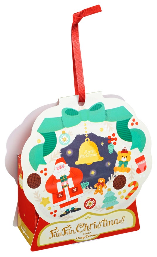 特長:ツリーに飾る星形のオーナメントをイメージしたボックスです。表面はオーナメントを眺めるサンタさんとトナカイさん、裏面はトナカイさんとプレゼントを手に持つサンタさんをデザイン。中にはホワイトチョコクッキーとフランボワーズクッキーをアソートしました。