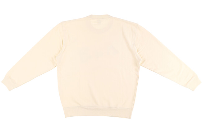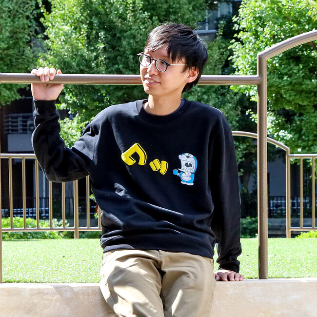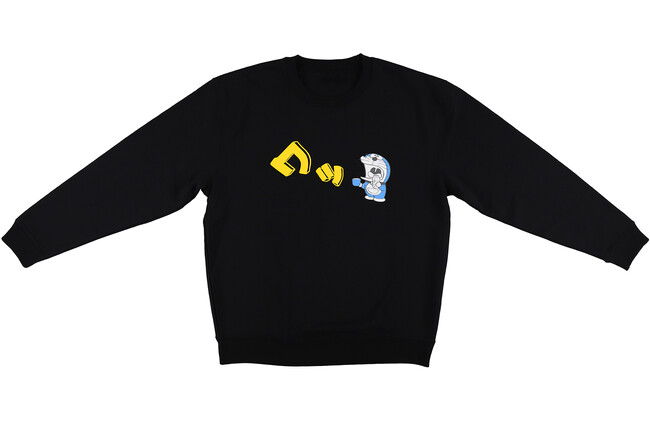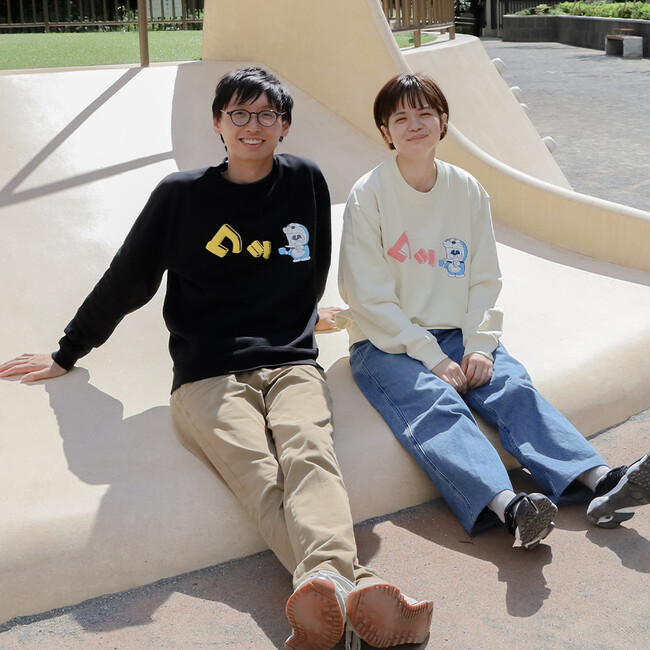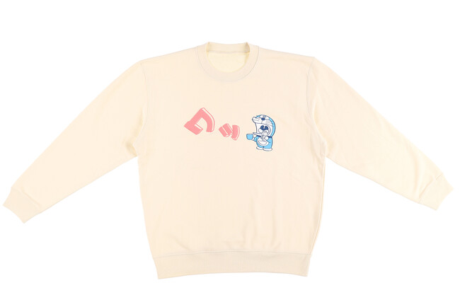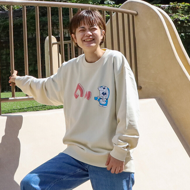 男女問わずユニセックスに着用いただける、オーバーサイズのゆったりとしたトレーナーです。前面には、飲んで大きな声を出すとその声がかたまりになって飛びだすようになる、ひみつ道具の「コエカタマリン」を使用したシーンが描かれており、ドラえもんが出した「ワッ」という声がかたまった様子をぷっくりとした発泡プリントで表現した、遊び心たっぷりなデザインです。アイボリーとブラックの2色展開で、その日のスタイルに合わせて色違いで揃えたり、リンクコーデとして着用いただくのもおすすめです。