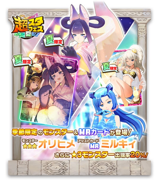 今回のガチャイベント「超スタフェス(夏)」では、新モンスター2種、新アシストカード2種が登場します。新★3モンスターにキュービ種「オリヒメ」とピクシー種「マーキュリー」の2種、新アシストカードにライフ&丈夫さのタイプ「タフネス」モン類【獣族】黄オーラで登場する「ジュリア&ミルキー」とSSR「【夏色メモリーズ】ピーシィ」の2種が登場します。ほかにも「マスターハート」、「黄のオーラハート」、「黄のプシュケー」、「超ごちそうもどき」などの豪華報酬が得られる育成ランキングイベント「モンスターグランプリ」を開催します。