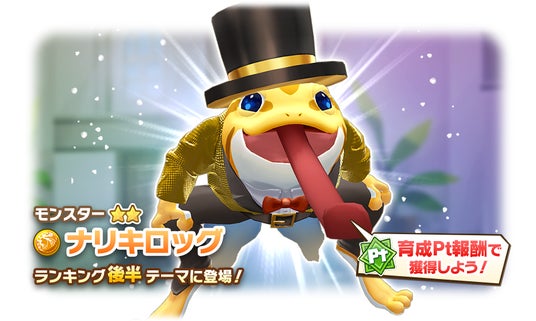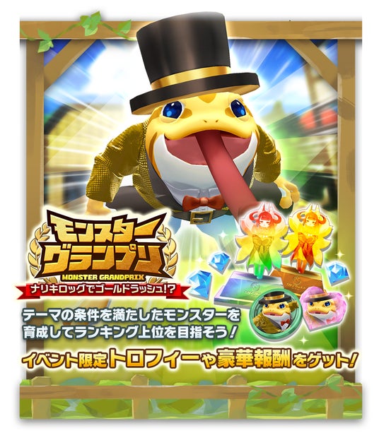 「モンスターグランプリ『ナリキロッグでゴールドラッシュ!?』」を開催します。前半、後半で3つずつ用意されたテーマに沿ってモンスターを育成完了し、「いいね(総合力を元にしたポイント)」でランキングを競います。月の前半、後半を合算した総合ランキングにより獲得できる専用トロフィーには総合ランキングの順位が保存され、いつでも確認することができます。イベントの詳細はゲーム内にてご確認ください。