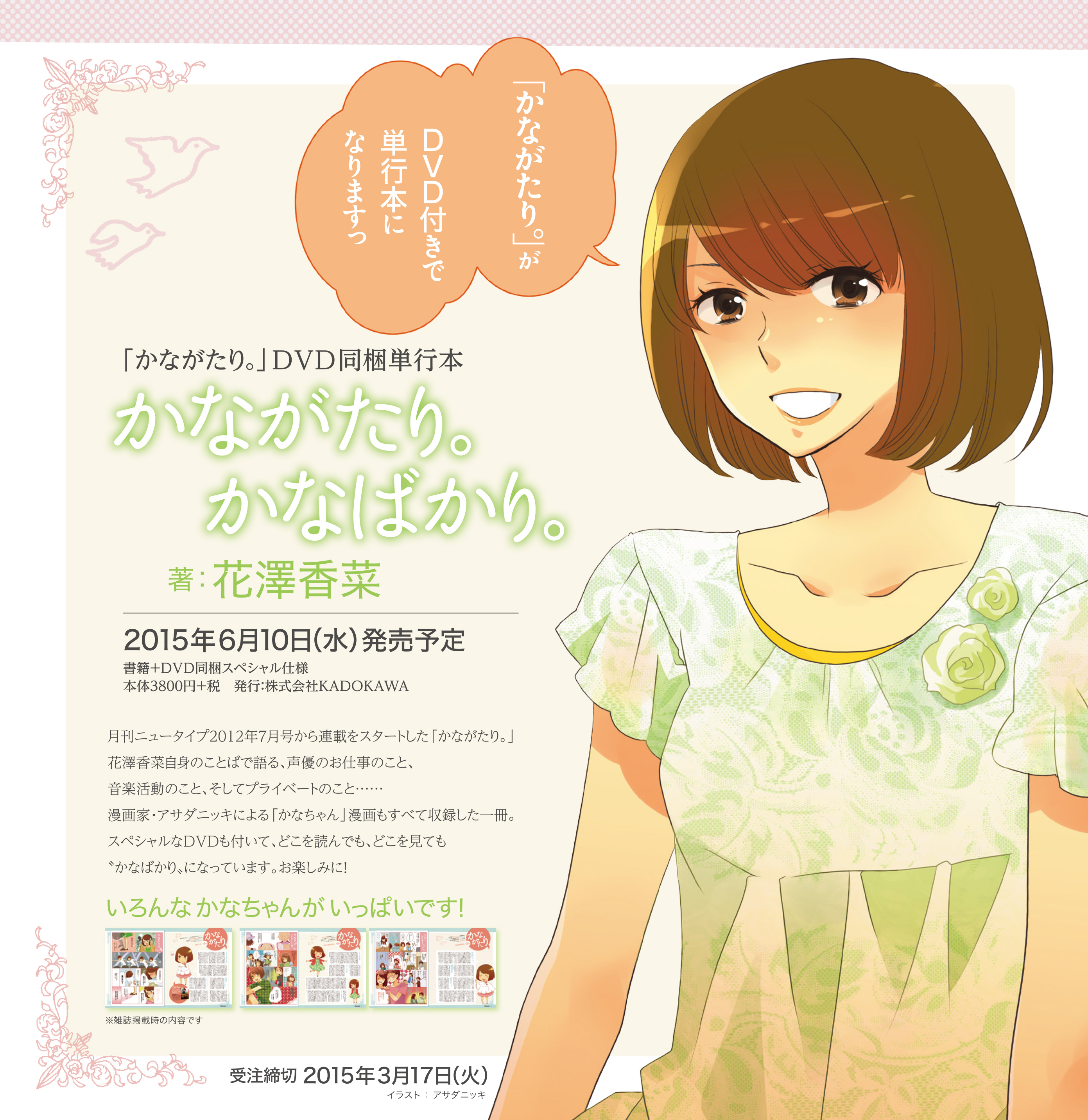 株式会社KADOKAWAは6月10日、声優・花澤香菜のDVD同梱単行本「かながたり。 かなばかり。」を発売します。受注締切は2015年3月24日。