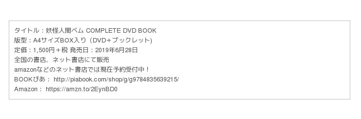 「あしたのジョー」「あしたのジョー2」「宝島」に続く、ぴあ DVD BOOKシリーズとして、TVアニメ版「妖怪人間ベム」全26話+パイロット版「妖怪人間ベムパートII」を全3巻に分けて完全収録する『妖怪人間ベム COMPLETE DVD BOOK』シリーズが、6月28日より月1回ペースで刊行スタートします。