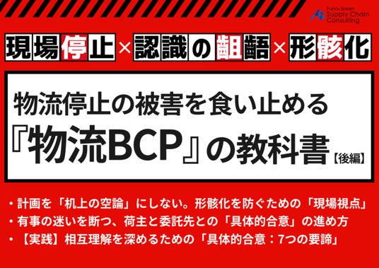 株式会社船井総研サプライチェーンコンサルティング(本社:東京都中央区、代表取締役社長:橋本 直行、以下「船井総研SC」)は、「現場停止×認識の齟齬×形骸化 物流停止の被害を食い止める“物流BCP”の教科書‐後編‐」の資料を公開いたしました。
