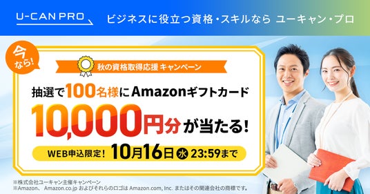 通信教育を手掛ける株式会社ユーキャン(東京都新宿区、代表取締役社長:品川 泰一)は、2024年9月1日(日)より、抽選で100名様にAmazonギフトカード10,000円分が当たる『WEB限定 秋の資格取得応援キャンペーン』を開始しました。