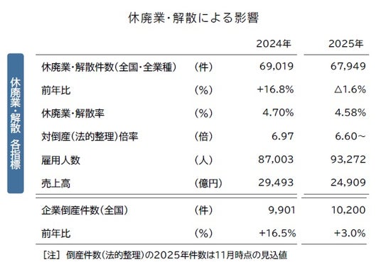 2025年に全国で休業・廃業、解散した企業は6万7949件となった。年間で最多だった前年(6万9019件)から1.6%減少し、3年ぶりに前年を下回ったものの、過去10年では2024年に次いで2番目に多い水準となった。
