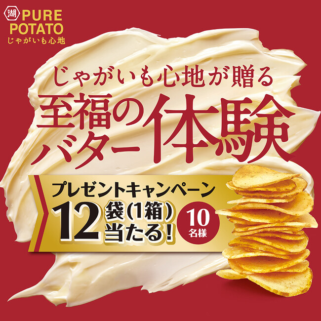 新商品「じゃがいも心地 バターの魅惑と岩塩」の圧倒的なバター感を、みなさまにもぜひご自身で体験していただきたいとの思いから、商品1箱(12袋入)を抽選で10名様にプレゼントするキャンペーンを実施します。