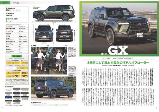 定型フォーマットによる詳密解説は、実に全52台を掲載。ついに発売されたレクサスGXも、真っ先に公道取材レポートを掲載しました。