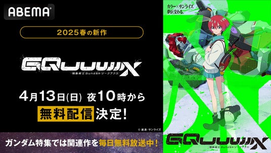 なお「ABEMA」では、ガンダム歴代シリーズを毎日無料放送する「ガンダム特集」を実施中。『機動戦士Gundam GQuuuuuuX(ジークアクス)』の放送開始に合わせ、4月5日(土)より順次、『機動戦士ガンダム』『機動戦士Ζガンダム』『機動戦士ガンダムZZ』『機動戦士ガンダム 水星の魔女』の全話無料一挙放送も実施いたします。ぜひ合わせてお楽しみください。