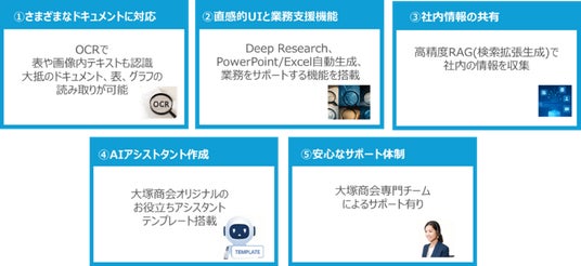 今回提供する『たよれーるneoAI Chat mini』は、株式会社neoAIが提供する企業向け生成AI「neoAI Chat mini」をより中堅・中小のお客様が導入しやすいよう大塚商会オリジナルのサービスをつけて提供します。本サービスでは、中堅・中小企業で利用頻度の高い業務アシスタントテンプレートを複数ご用意していますので、特に手間のかかる設定も必要なくすぐに導入いただけます。また、お客様がより安心してご利用いただけるよう、当社専門チームによる製品のサポートも行います。