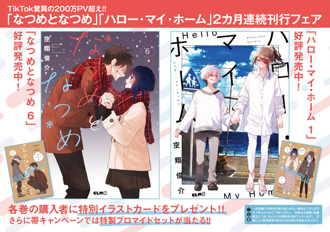 『なつめとなつめ 6』(2023年1月11日発売)と『ハロー・マイ・ホーム 1』(2023年2月10日発売)の帯に付いている応募券を切り取り、2枚1組でハガキに貼り、ご応募いただいた方の中から抽選で50名様に『なつめとなつめ』『ハロー・マイ・ホーム』描き下ろしブロマイドセットをプレゼントいたします。