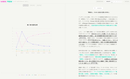 <Webページ画面例:数字が表す実態(左:働く場の選択比率)から、その裏にある社会的・文化的な背景を考察(右:「馴染む」ために出社を望む日本人)>