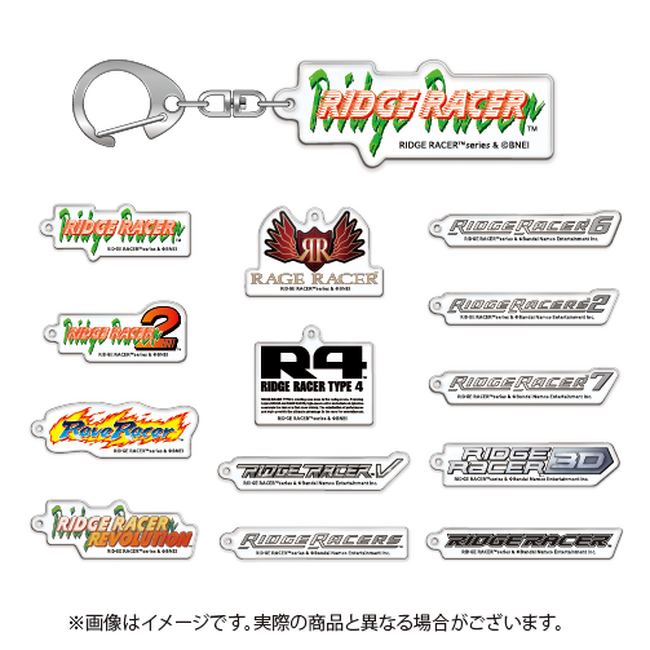 リッジレーサーシリーズのタイトルロゴのアクリルキーホルダーです。どの絵柄になるかは袋を開けてみてのお楽しみです。
