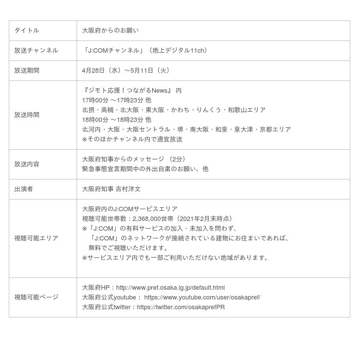 なお、このメッセージは、大阪府内各エリアで放送中の地域情報番組『ジモト応援!つながるNews』をはじめとするJ:COMチャンネルの各番組内で放送するほか、大阪府のホームぺージ(通常サイト)やYouTubeの大阪府公式チャンネルなどでも、ご覧いただくことができます。