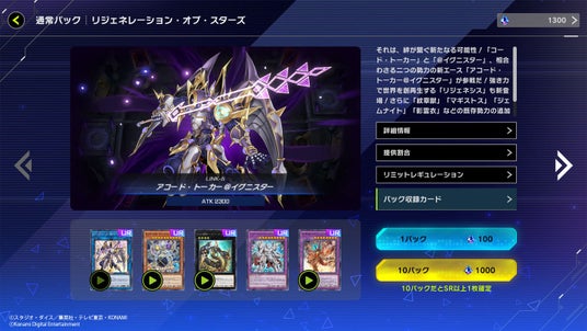 また、新たなセレクションパック「リジェネレーション・オブ・スターズ」を本日追加しました。「リジェネレーション・オブ・スターズ」は、「リジェネシス」テーマの「創世の神 デウテロノミオン」や、「@イグニスター」テーマの「アコード・トーカー@イグニスター」など、デッキ強化に役立つカードを多数収録しています。