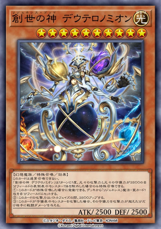 「創世の神 デウテロノミオン」は1ターンに1度、元々の攻撃力と元々の守備力が2500の自分フィールドの表側表示モンスター1体を除外した場合のみ特殊召喚できる。