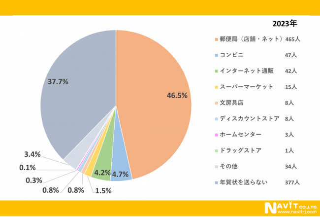 年賀状を購入する場所に関してのアンケートでは「郵便局」が1番多く46.5%と、ほぼ半数を占めました。