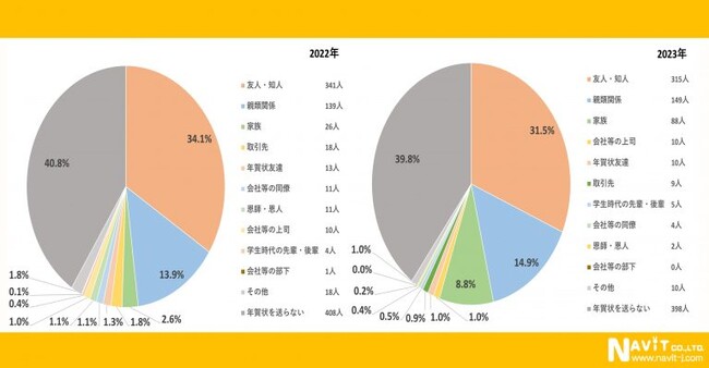 年賀状を誰に送りますか。という質問に対して昨年同様に1番多かったのが「友人・知人」で昨年より2.6%減っているものの2023年は31.5%となっています。