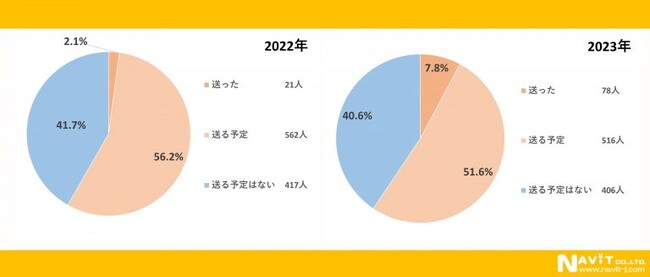 来年(2024年)、年賀状を送りますか。という質問に対して昨年同様に1番多かったのが「送る予定」で昨年より4.6%減っているものの2023年は51.6%となっています。