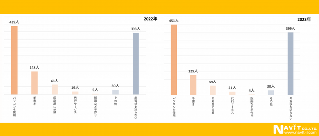 どのような方法で年賀状を作成するかというアンケートでは昨年に引き続き「パソコン」を使用して年賀状を作成する方が1番多く451名となっています。