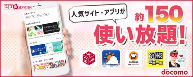 スゴ得コンテンツはドコモが厳選した定番から人気のゲームまで約150種類のコンテンツが月額380円(税別)で使い放題のサービスです。