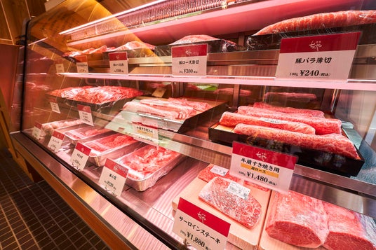 併設する「精肉ちんや」では、この「適サシ肉」をはじめ、店舗でカットした牛・豚肉各種やハンバーグ、「牛肉のしぐれ煮」、すき焼き関連商品(割り下、白滝、千住ネギなど)などを揃え、お客様をお迎えしています。