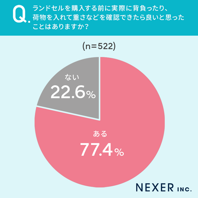 77.4%と8割近くの方が、ランドセルを購入する前に「実際に荷物を入れて重さなどを確認したい」と回答しています。