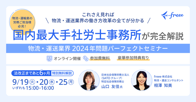freee株式会社(本社:東京都品川区、CEO:佐々木大輔、以下「freee」)は9月19日(火)20日(水)25日(月)の3日間で「物流・運送業界2024年問題パーフェクトセミナー」をオンラインで開催します。