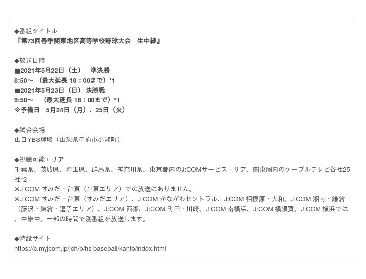 関東圏内J:COMグループ5社(法人一覧参照)は、2021年5月22日(土)、5月23日(日)に山日YBS球場(山梨県甲府市)で開催される「第73回春季関東地区高等学校野球大会」の準決勝、決勝をJ:COMのコミュニティチャンネル「J:COMチャンネル」(地デジ11ch)で、実況生中継で放送します。春季関東地区高等学校野球大会の生中継はJ:COM初となります。