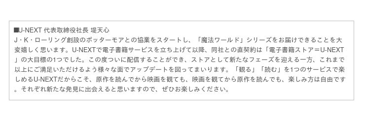 今回の取り組みについてU-NEXT 代表取締役社長 堤天心と、ポッターモアのジェニー・マッキャン氏は以下のようにコメントしています。