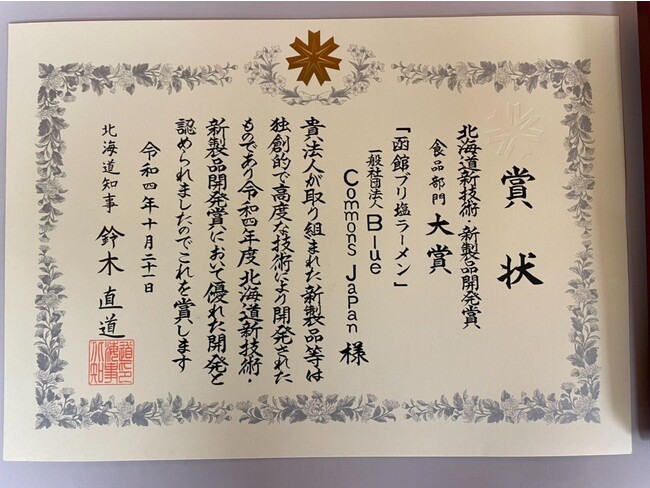 2022年10月21日(金)に、北海道庁本庁舎にて、『令和4年度北海道新技術・新製品開発賞』の一般社団法人Blue Commons Japanが受賞した食品部門やその他、ものづくり部門、デザイン部門などの授賞式が行われました。函館ブリ塩ラーメンは、技術力や新規性、独創性などが評価されノミネートされた全製品の中から特に優れたものとして大賞を受賞いたしました。