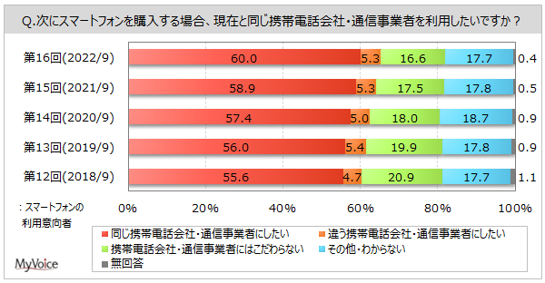 スマートフォン利用意向者に、次回購入時に現在と同じ携帯電話会社・通信事業者にしたいかを聞きました。