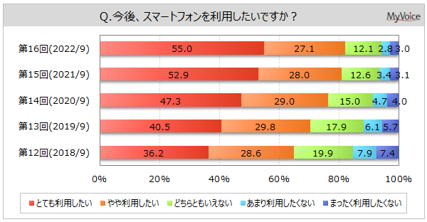 スマートフォンの利用意向者(「とても利用したい」「やや利用したい」の合計)は8割強です。「とても利用したい」が55.0%で、過去調査と比べて増加傾向です。