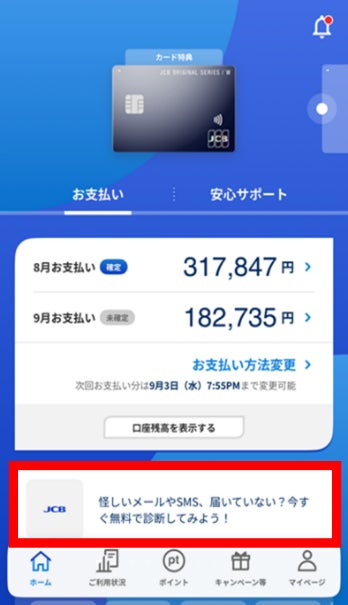 「MyJCB」は、ご利用金額やポイント残高の確認、安全・安心をサポートするメール配信など、JCBカード会員専用のWEBサービスです。
