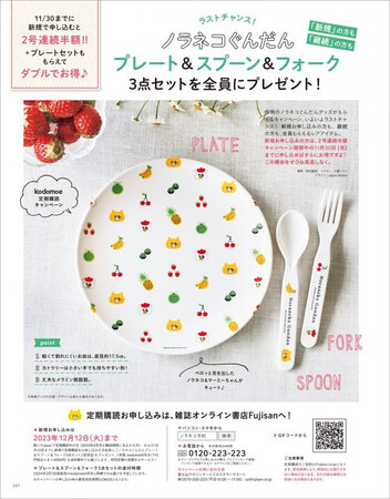 新規お申し込みの方も、すでに定期購読中の方(2024年4月号が購読期間に含まれる方)も、全員もれなくノラネコぐんだんプレート&スプーン&フォークの3点セットがもらえます! ここでしか手に入らないレアアイテムをゲットできるのは12月12日(火)まで! 新規お申し込みの方は、2号連続半額キャンペーン実施中の11月30日(水)までに申し込むと、さらにお得です。詳しくはこちらから↓