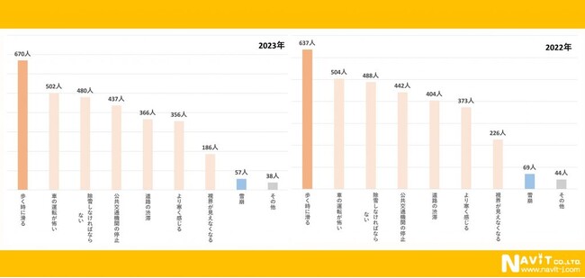 こちらは複数回答でいただいています。1番回答数が多かった雪の困りごとは昨年(637人)に引き続き「歩く時に滑る」で670人と去年の回答より33名増えています。次に多かったのが「車の運転が怖い」で502人。こちらは去年(504人)とほぼ変わらない回答数となっています。どちらも滑るというのがポイントになっています。