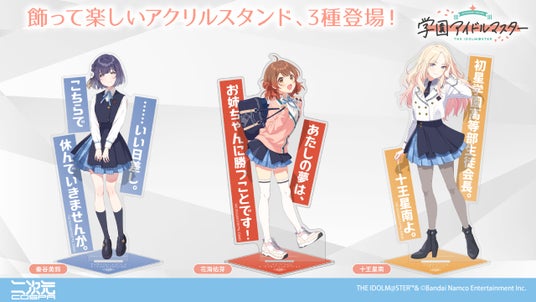 『学園アイドルマスター』より、「十王星南」「花海佑芽」「秦谷美鈴」アイドル3人の「アクリルスタンド」が二次元コスパから登場。