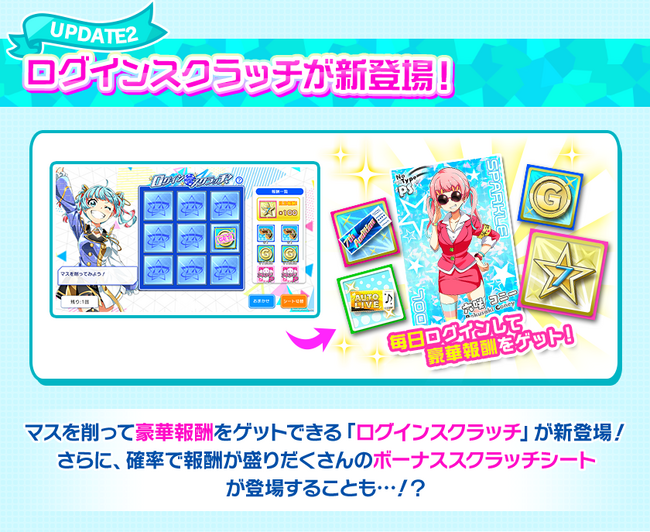 1日1回マスを削って豪華報酬をゲットできる新要素「ログインスクラッチ」が新登場します。毎日ログインして、セブンスコインや育成アイテムなどの報酬を獲得するチャンスです。