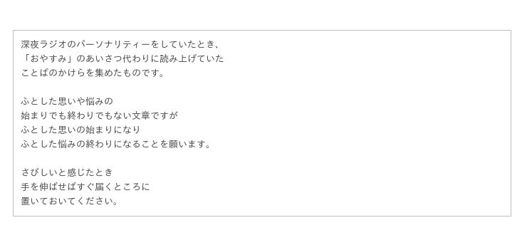 本書は、タブロが自身のラジオ番組「TABLOと夢見るラジオ」の終わりに読み上げた短いメッセージをまとめた一冊です。