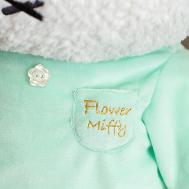 着せ替えできる大人気のフラワーミッフィーオリジナルぬいぐるみ「ほわほわ着せ替えぬいぐるみ」が、全長約80cmの特大サイズで登場します。淡いグリーンのお洋服とお花の形のボタン、足裏の色とりどりの花柄はそのままに、胸ポケット部分に「Flower Miffy」と金色の刺しゅうが入った特別仕様です。