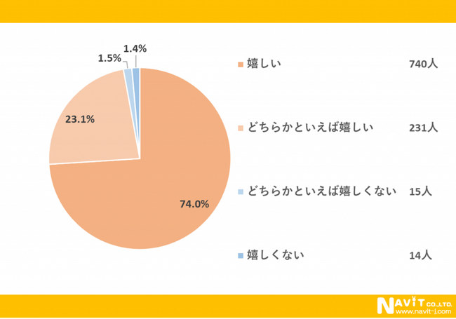 「焼き菓子を贈り物として貰うのは嬉しいですか?」という質問については、「嬉しい」が74.0%、「どちらかといえば嬉しい」が23.1%という結果になり、合わせると97.1%の人が嬉しいと感じていることが分かりました。