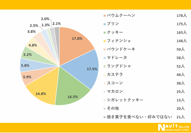 最も好きな焼き菓子については、「バウムクーヘン」が17.8%、「プリン」が17.5%、「クッキー」が16.5%という順になりました。
