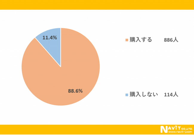 「焼き菓子を購入しますか?」という質問については、「購入する」が88.6%、「購入しない」が11.4%という結果になりました。
